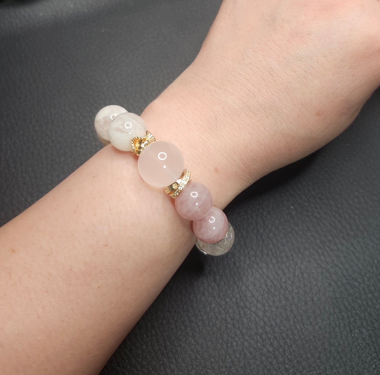 ・優しい波動を持つ天然石を組み合わせ、いちごミルクを思わせるような可愛らしい大玉のブレスレットです。