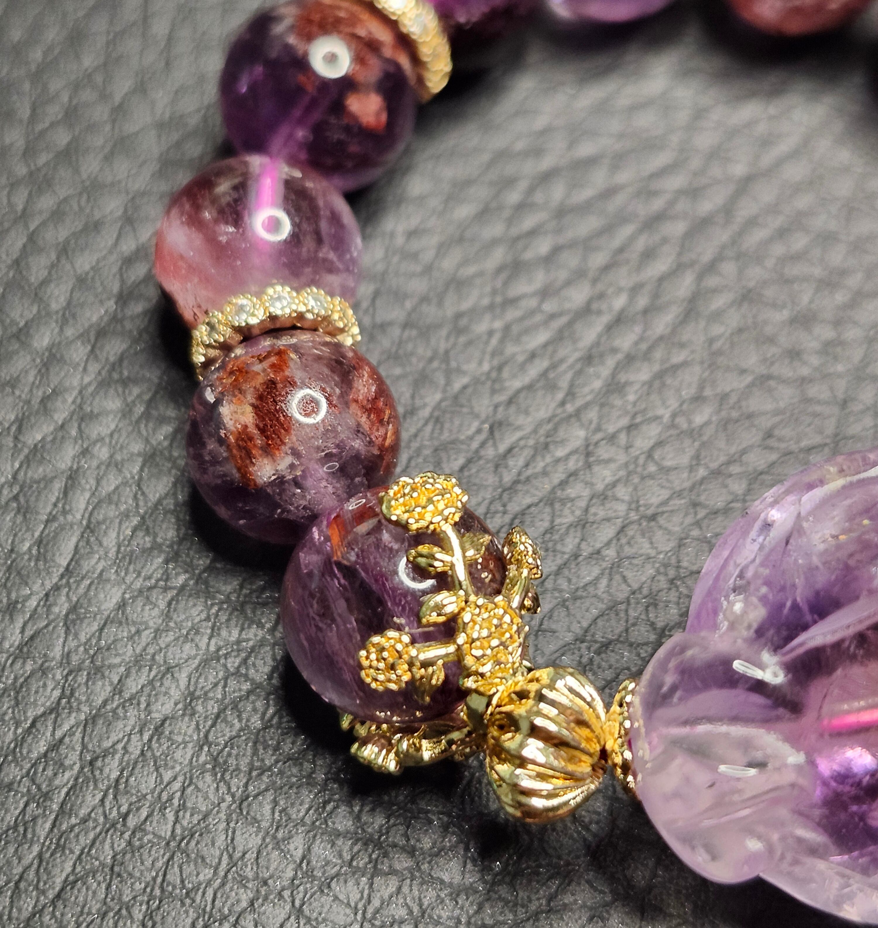 ・財運の神獣として知られる貔貅をメインとして、ガーデンアメジストとシンプルなアメジストのブレスレットの二本セットです。